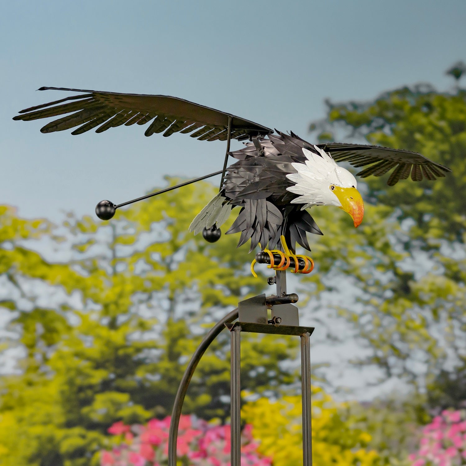 - This large life size metal Eagle is painted with stunning realism and bodily and feather details. When the wind blows, the Eagle will rock back and forth and his wings will flap up and down together, balanced by the rods and balls. A very dramatic kinetic movement and presence! Large Rocker Stakes are available in 4 styles - Eagle, Owl, Crane and Heron. Detailed realism in the metal feathers and body. Wings flap up and down together in the wind. 4 prong deep thick stake to secure in the ground. Weather & fade resistant paint.